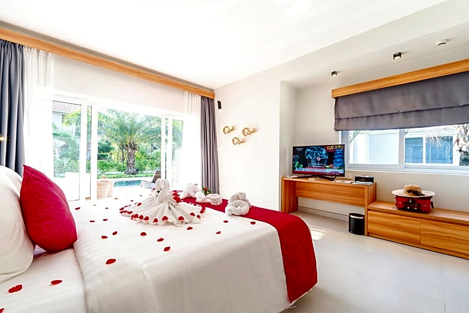 Luxury Pool Villa Twin is 560 square feet and includes a queen-size bed 150-154 width plus extra beds on demand, desk, cable tv, and slippers.